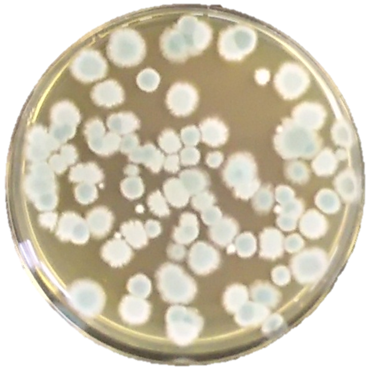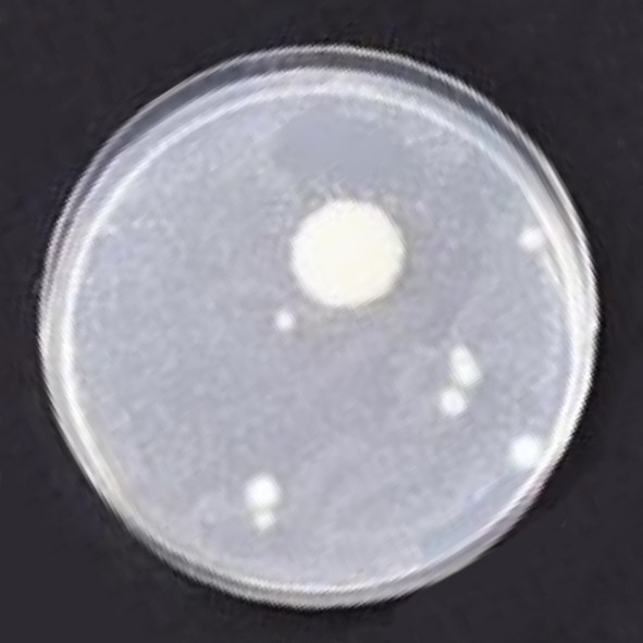 一見すると、白い円形の部分がカビやバクテリアそのもののように見えるかもしれませんが、白い円自体が単体のカビやバクテリアを示しているわけではありません。実際には、培地の背景色が変化している部分一帯に、カビやバクテリアが広く存在していることが確認されています。その中でも、特に微生物が高密度に集積し、増殖が飽和した領域が白く見えている状態です。