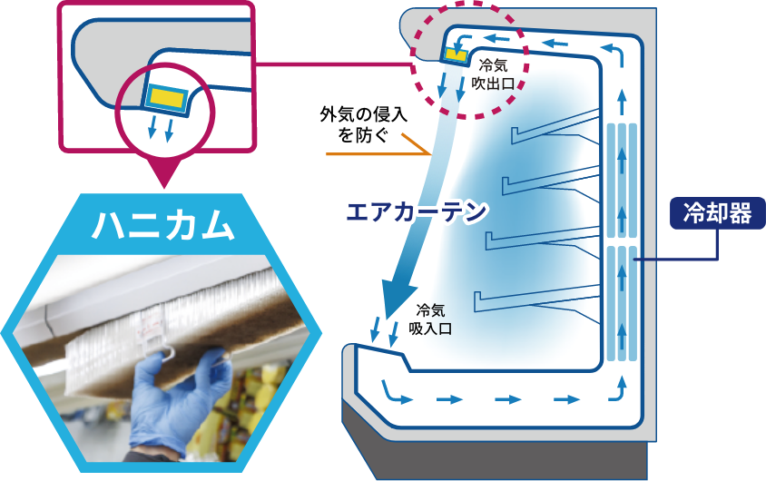 ハニカムとは、食品ショーケースの上部などに取り付けられている空気の通り道となる部材 のことです。冷気を効率よく循環させるために、多くの冷蔵ショーケースで使われています。